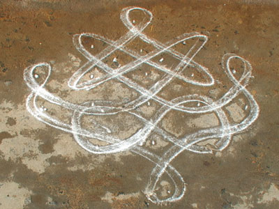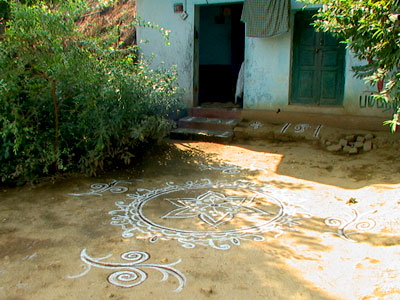 At dawn, the women make these beautiful mandala patterns outside the doors of the houses.
