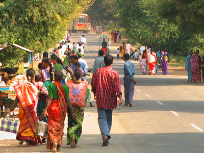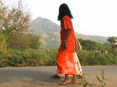 Somewhat similar to the way Muslims travel to Mekka to walk around a big, black stone, Hindus come from far away to walk the 14-kilometer route around Mount Arunachala, called Pradakshina. |