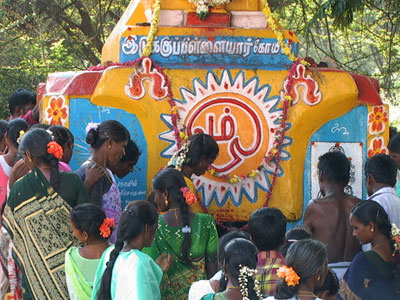 In particular the women are dressed in their finest clothes when they do the Pradakshina walk as if they were going to a gala party. They all wear white or orange flowers in their long dark hair. |