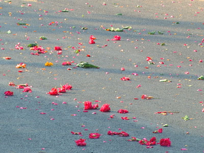 A funeral procession passes by, and people throw flowers everywhere. They are supposed to be run over by vehicles afterwards, symbolizing that "such is life”: “Today I shine. Tomorrow I am dead. Today I shine. Tomorrow I am dead.” (The lyrics of a song which the women sings). |