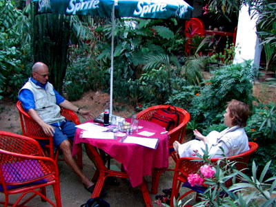 At dusk time, surrounded by hungry mosqitos, we take our first Indian supper at the Auro Usha Resturant. I'm having a delicious “Tomato Paneer Butter Fry” with green vegetable soup. |