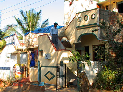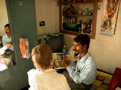 At the hotel, we meet 29 year-old Suresh who offers to help me find a shop in town where they sell computers assesories. At this point, we actually don't know exactly where to go next in India. I'm thinking of going up to Goa, after some more time in Mysore. Padma suggests to try to find a certain holy place. So without any address or phone number, our taxidriver, Baba, and Suresh take us on a long search in the outskirts of town, asking around. Eventually, we succeed in finding it.