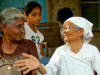 At right: Nanjama, Biddu's mother, is 93 years old, has given birth to nine children, and still full of live and humour. |
